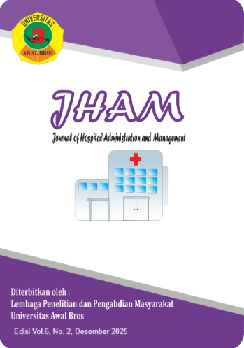 Vol. 6 No. 2 (2025)The Journal of Hospital Administration and Management (JHAM) Volume 6, Number 2, 2025, is the twelfth issue published by the Research and Community Service Institute (LPPM) of Universitas Awal Bros. This journal contains research findings from various researchers that have undergone a peer-review and copy-editing process.